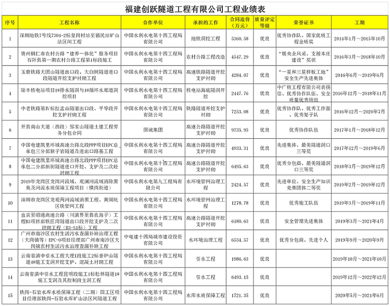 福建创跃隧道工程有限公司近年工程业绩证明